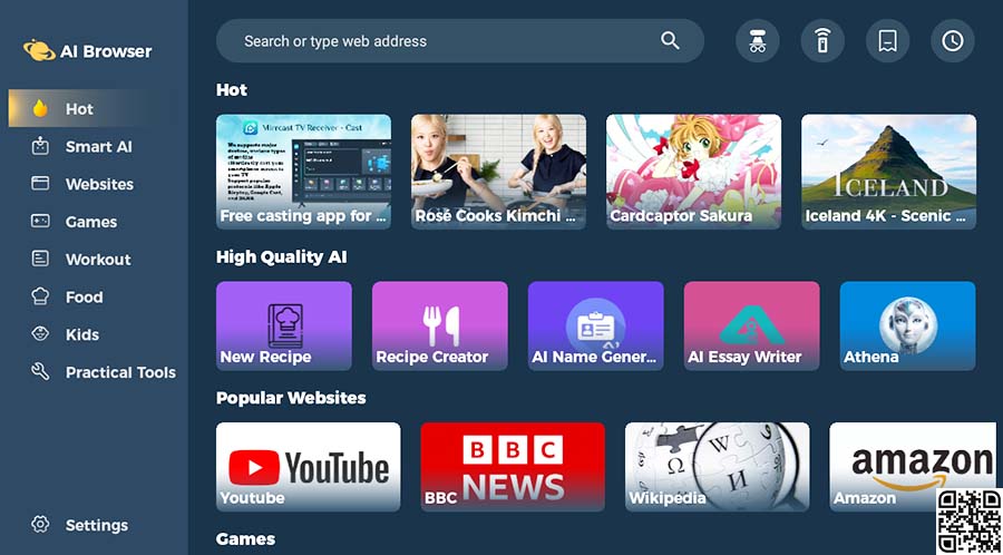 AI Browser 分类:全球类 大小:11MB 热度:104 点评:0 发布: 2025-05-06 语言:英文 ①下载 ②下载 APP截图 应用介绍 名称:AI Browser(安卓电视浏览器)简介:一款专门为安卓智能电视而设计的浏览器属性:英文备注:内置显示的部分网址需要全球网络下载试用:① AI浏览器电视版_1.1.8.apk① AI浏览器配套WIFI遥控器(手机)_1.0.6.apk下载提取码见页面底部↓ 相关应用 CVTV+ WeTV myTV-SUPER LiveTV Google Play Store HouseTV X64 BrowseHere浏览器 GreenTuber Zero TV 全球TV