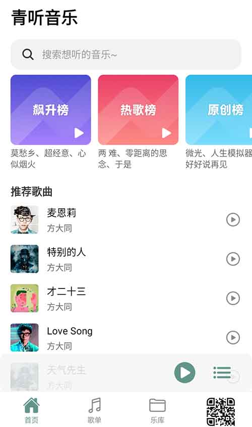 青听音乐 分类:音乐类 大小:26.6MB 热度:394 点评:0 发布: 2025-06-11 语言:简体中文 ①下载 ②下载 APP截图 应用介绍 名称:青听音乐 手机版简介:热歌、原创、新歌、说唱、古典、韩语、日语、国风备注:支持无损音乐下载下载试用:①青听音乐_1_0_7_支持无损音乐下载.apk下载提取码:见页面底部↓ 相关应用 糖豆广场舞 兰调KTV 咪咕爱唱TV 时光KTV SollinPlayer MoeKoe Music第三方酷狗 小米蜻蜓FM 隆庭KTV AlgerMusicPlayer 金调KTV