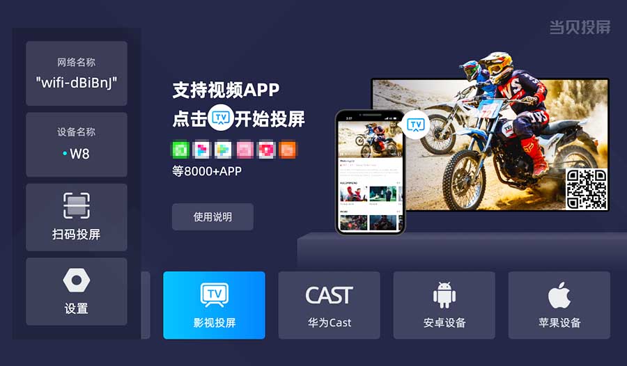 简介:集成了AirPlay、当贝cast、DLNA、华为cast+等多种投屏技术,为网络电视和相关设备提供投屏服务。目前已支持爱奇艺、优酷、腾讯等数十款主流视频软件,也支持苹果、安卓、华为等不同的设备型号,打造多屏互动的完美影音体验。
